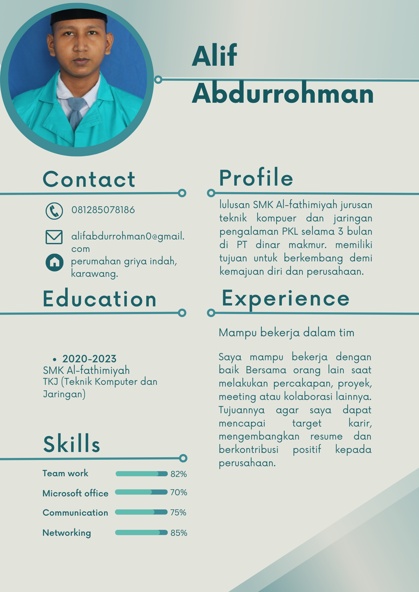 Saya adalah seorang junior web develper dengan keahlian pengembangan Website. Mampu menciptakan pengalaman pengguna yang menarik melalui desain UI/UX yang inovatif. serta mampu beradaptasi dengan perubahan pasar. Latar belakang pendidikan yang kuat dan siap untuk berkontribusi dalam tim yang dinamis dan inovatif, termasuk pengalaman dalam network administration.